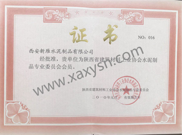 西安新雁水泥制品有限公司为陕西省建筑材料工业协会水泥制品专业委员会会员